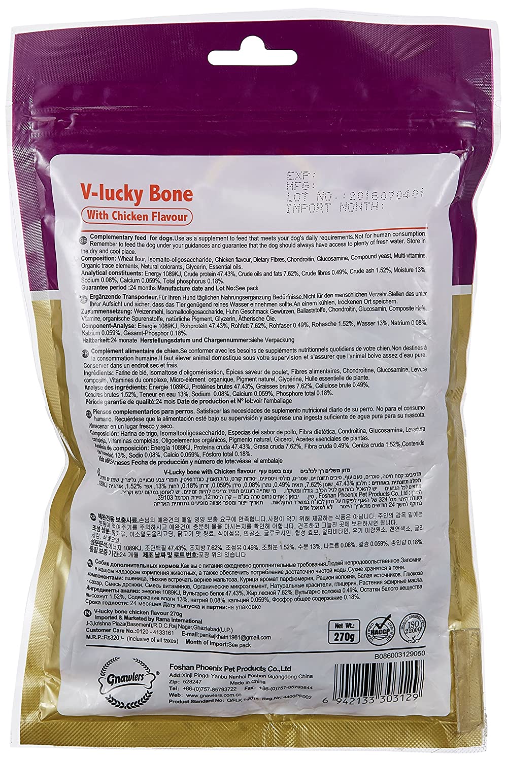 Gnawlers Puppy Snack - V lucky bone - 270GM - Chicken Flavour