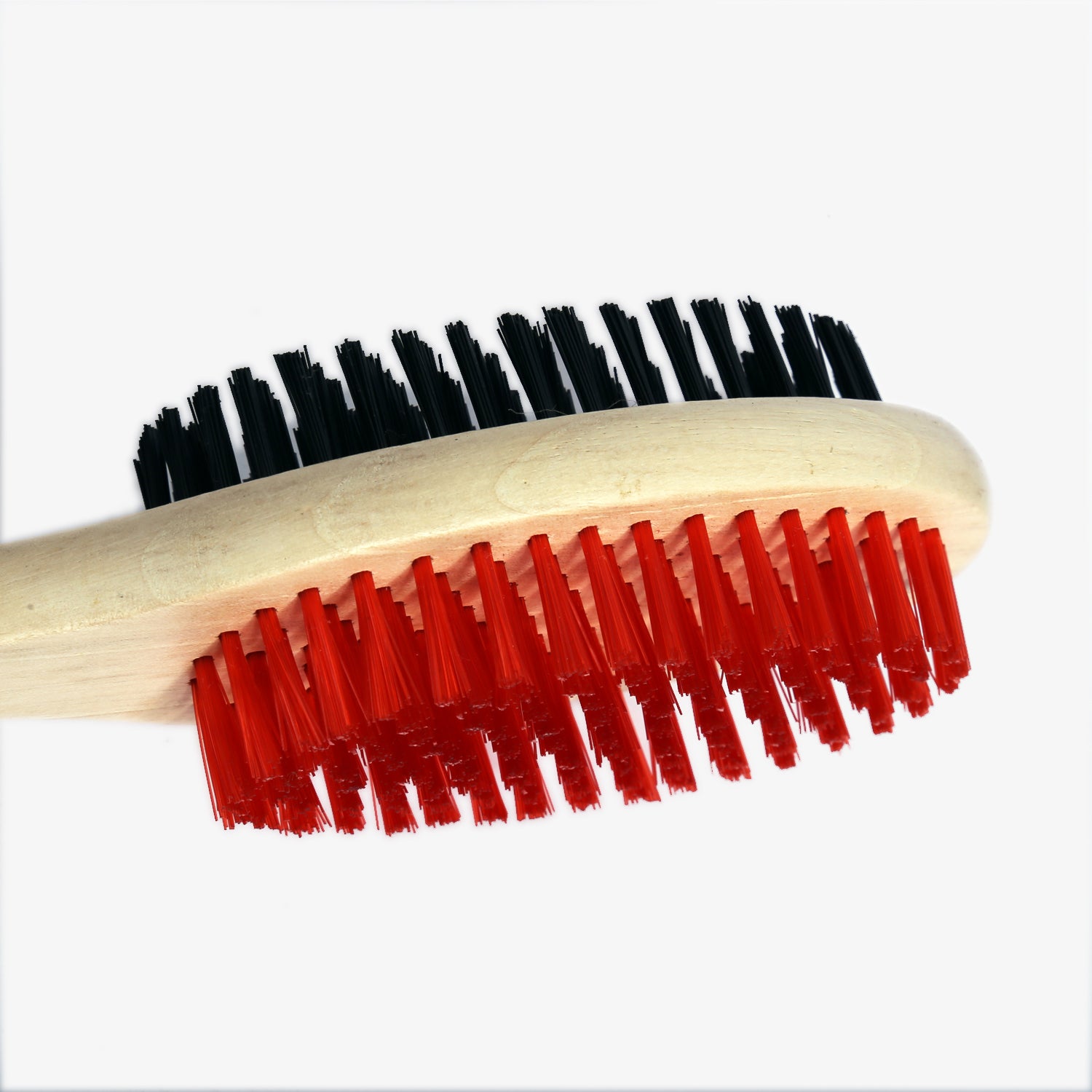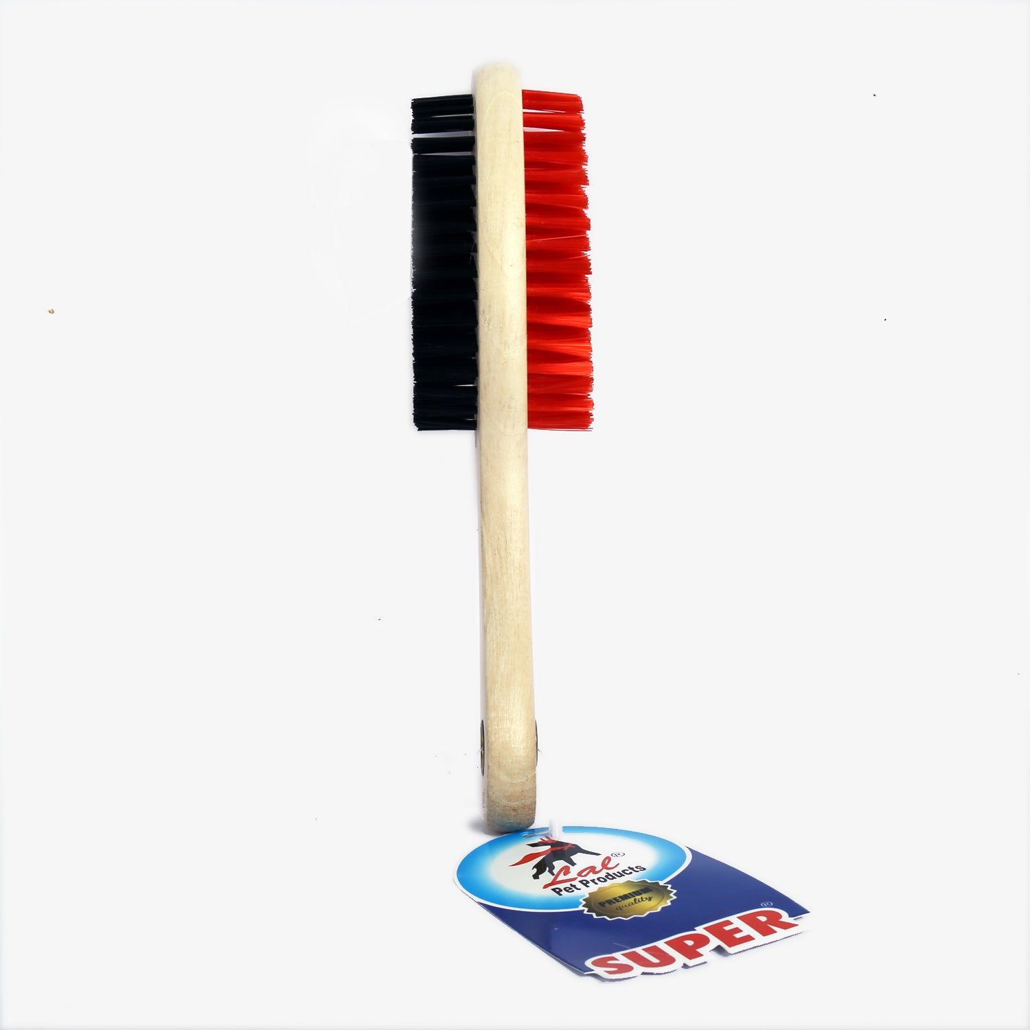 - This Wooden handle brush accomplishes a variety of functions that include reducing shedding, removing tangles, and promoting skin and coat health. Comes with durable handle and ultra soft bristles.